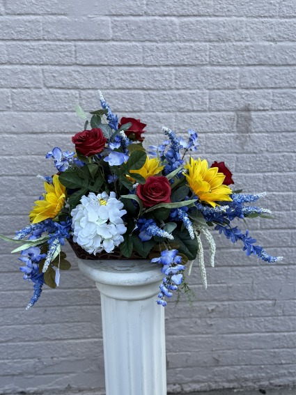 This stunning silk arrangement brings together a rich tapestry of color and meaning, featuring sunflowers for joy, Texas bluebonnets for pride and heritage, red roses for love, and cascading blue wisteria for grace. Whether used for home decor or memorial setting, this arrangement offers a beautiful celebration of life, memory, and natural beauty.